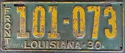1930 | Embossed yellow serial on green plate with border line; "LOUISIANA-30" centered at bottom; vertical "FRONT" or "REAR" at left | none | 123-456 | 1 to approximately 254-000 | |
