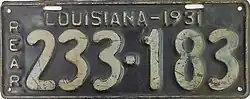 1931 | Embossed white serial on dark blue plate with border line; "LOUISIANA–1931" centered at top; vertical "FRONT" or "REAR" at left | none | 123-456 | 1 to approximately 249-000 | |
