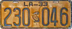 1933 | Embossed black serial with pelican separator on orange plate with border line; "LA–33" centered at top | none | 123-456 | Issued in blocks by horsepower class and branch office | |