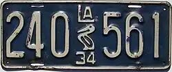 1934 | Embossed white serial with pelican separator on dark blue plate with border line; "LA" and "34" above and below pelican respectively | none | 123-456 | Issued in blocks by horsepower class and branch office | |