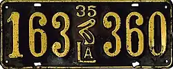 1935 | Embossed yellow serial with pelican separator on purple plate with border line; "35" and "LA" above and below pelican respectively | none | 123-456 | Issued in blocks by horsepower class and branch office | |