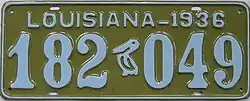 1936 | Embossed light blue serial with pelican separator on olive green plate with border line; "LOUISIANA–1936" centered at top | none | 123-456 | Issued in blocks by horsepower class and branch office | |