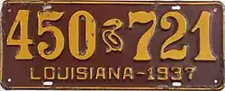1937 | Embossed golden yellow serial with pelican separator on maroon plate with border line; "LOUISIANA–1937" centered at bottom | none | 123-456 | Issued in blocks by horsepower class and branch office | |