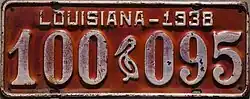 1938 | Embossed white serial with pelican separator on red plate with border line; "LOUISIANA–1938" centered at top | none | 123-456 | Issued in blocks by horsepower class and branch office | |