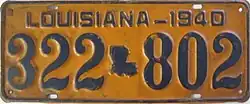 1940 | Embossed dark blue serial with state-shaped separator on orange plate with border line; "LOUISIANA–1940" centered at top | none | 123-456 | Issued in blocks by horsepower class and branch office | |