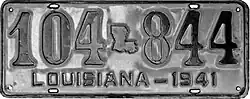 1941 | Embossed black serial with state-shaped separator on white plate with border line; "LOUISIANA–1941" centered at bottom | none | 123-456 | 1-001 to approximately 406-000 | |