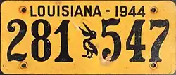 1944 | Black serial with pelican separator on yellow fiberboard plate; "LOUISIANA - 1944" centered at top | none | 123-456 | 1-001 to approximately 380-000 | Manufactured on soybean-based fiberboard due to ongoing metal conservation. |