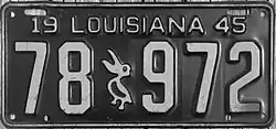 1945 | Embossed white serial with pelican separator on black plate with border line; "19 LOUISIANA 45" at top | none | 123-456 | 1-001 to approximately 341-000 | |