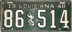 1948 | Embossed white serial with pelican separator on dark green plate with border line; "19 LOUISIANA 48" at top | none | 123-456 | 1-001 to 380-000; 400-001 to approximately 410-000 |