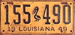 1949 | Embossed black serial with pelican separator on yellow plate with border line; "19 LOUISIANA 49" at bottom | none | 123-456 | 1-001 to 380-000; 435-001 to approximately 485-000 |