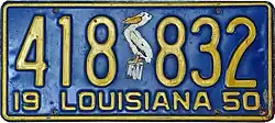 1950 | Embossed yellow serial on royal blue plate with border line; pelican decal used as separator; "19 LOUISIANA 50" at bottom | none | 123-456 | 1-001 to 490-000; 550-001 to approximately 615-000 |