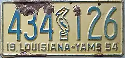 1954 | Embossed blue serial with pelican separator on beige plate with border line; "19" at bottom left and "54" at bottom right | "LOUISIANA-YAMS" centered at bottom | 123-456 | 1-001 to approximately 700-000 | |