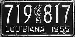1955 | Embossed white serial with pelican separator on black plate with border line; "LOUISIANA 1955" at bottom | none | 123-456 | 1-001 to approximately 740-000 | First 6" x 12" plate. |