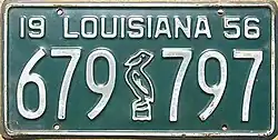 1956 | Embossed white serial with pelican separator on dark green plate with border line; "19 LOUISIANA 56" at top | none | 123-456 | 1-001 to approximately 801-000 | |