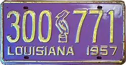 1957 | Embossed golden yellow serial with pelican separator on purple plate with border line; "LOUISIANA 1957" at bottom | none | 123-456 | 1-001 to approximately 865-000 | |