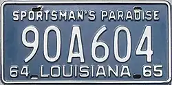 1964–65 | Embossed white serial on dark blue plate with border line; "64 LOUISIANA 65" at bottom | "SPORTSMAN'S PARADISE" at top | 123A456 | Letter corresponds to State Police troop area of issue | |