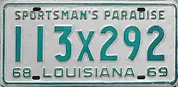 1968–69 | Embossed green serial on reflective white plate with border line; "68 LOUISIANA 69" at bottom | "SPORTSMAN'S PARADISE" at top | 123A456 | Letter corresponds to State Police troop area of issue | |