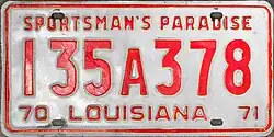 1970–71 | Embossed red serial on reflective white plate with border line; "70 LOUISIANA 71" at bottom | "SPORTSMAN'S PARADISE" at top | 123A456 | Letter corresponds to State Police troop area of issue | |