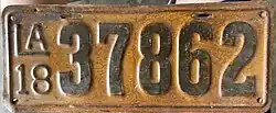 1918 | Embossed black serial on orange plate with border line; stylized "LA" and "18" at left | none | 12345 | 1 to approximately 40000 | |