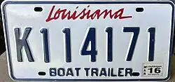 Boat Trailer | Embossed blue on white with border line; "LOUISIANA" at bottom; "BOAT TRAILER" at top | unknown | D123456 | Likely to have begun at D500000. |