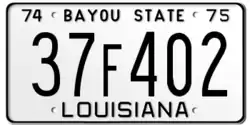 1974–75 | Embossed black serial on reflective white plate with border line; "LOUISIANA" centered at bottom; "74" at top left and "75" at top right | "BAYOU STATE" centered at top | 123A456 | Letter corresponds to State Police troop area of issue | |