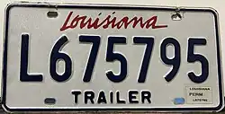 Trailer | Embossed red on white with border line; "LOUISIANA" at bottom; "TRAILER" at top | mid 1980s | A123456 | D series issued up to D499999 (higher numbers reserved for Boat Trailer), followed by part of E series. |