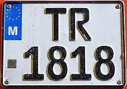 Maltese registration plates are the number plates used within Malta to uniquely identify motor vehicles. Since 1995, the three letter, three number system (ZZZ 999) has been in use in Malta for vehicle registration. The characters are always printed in black on a white background, and to the left one can find a blue box with the Flag of the European Union and the letter M (for Malta) underneath it in white. The typeface used on Maltese registration plates is FE-Schrift which is also the typeface used on German vehicle registration plates.