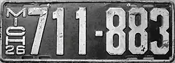 In 1956, the United States, Canada, and Mexico came to an agreement with the American Association of Motor Vehicle Administrators, the Automobile Manufacturers Association and the National Safety Council that standardized the size for license plates for vehicles (except those for motorcycles) at 6 inches (15 cm) in height by 12 inches (30 cm) in width, with standardized mounting holes.[3] The 1955 (dated 1956) issue was the first Michigan license plate that complied with these standards.