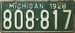 1928 | White on green; "MICHIGAN 1928" at top | none | 1-234-567 | 1 to approximately 1-116-000 | |