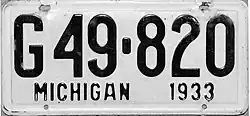 1933 | Black on white; "MICHIGAN 1933" at bottom | none | 12-345 A12-345 |