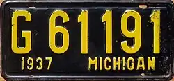 1937 | Yellow on dark blue; "1937 MICHIGAN" at bottom | none | 12 345 A 12345 |