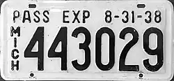 Black on white; vertical "MICH" at left; "PASS EXP 8-31-38" at top | none | 123456 | 1 to approximately 552000 | Half-year plates issued at lower cost to full-year plates, due to the Depression. | |
