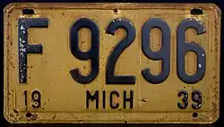 1939 | Black on beige; "19 MICH 39" at bottom | none | A 12345 AB 1234 |