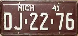 1941 | White on maroon; "MICH 41" at top | none | AB-12-34 | County-coded | |