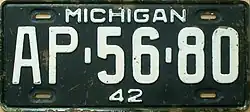 1942–43 | White on olive green; "MICHIGAN" at top and "42" at bottom | none | AB-12-34 | County-coded | Full and half-year plates revalidated for 1943 with metal tabs, due to metal conservation for World War II. |