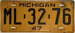 1947 | Black on golden yellow; "MICHIGAN" at top and "47" at bottom | none | AB-12-34 | County-coded | |