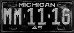 1949 | White on black; "MICHIGAN" at top and "49" at bottom | none | AB-12-34 | County-coded | |