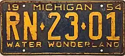 | 1954 | Yellow on dark blue; "19 MICHIGAN 54" at top | Water Wonderland | AB-12-34 | County-coded | ||
