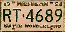 1956 | Dark green on white; "19 MICHIGAN 56" at top | Water Wonderland | AB-1234 | County-coded | First 6" x 12" plate. |