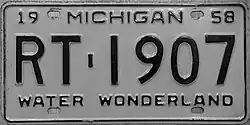 | 1958 | Black on gray; "19 MICHIGAN 58" at top | Water Wonderland | AB-1234 | County-coded | ||