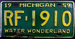 1959–61 | Yellow on green; "19 MICHIGAN 59" at top | Water Wonderland | AB-1234 | County-coded | Revalidated for 1960 with yellow tabs, and for 1961 with silver tabs. |