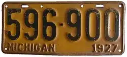 1927 | Black on yellow; "MICHIGAN 1927" at bottom | none | 123-456 | 1 to 999-999 | |