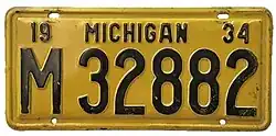 1934 | Black on yellow; "19 MICHIGAN 34" at top | none | 12-345 A 12345 |