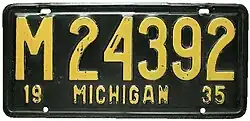 1935 | Yellow on dark blue; "19 MICHIGAN 35" at bottom | none | 12-345 A 12345 |