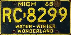 1965 | Yellow on blue; "MICH 65" at top | Water-Winter Wonderland | AB-1234 | County-coded | First year using galvanized steel. First year using state school colors: 1965 honored University of Michigan. |