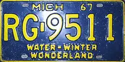 1967 | Maize on dark blue; "MICH 67" at top | Water-Winter Wonderland | AB-1234 | County-coded | Issued in the colors of the University of Michigan, in honor of its sesquicentennial. |