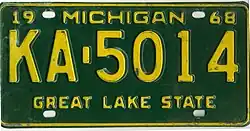 1968 | Yellow on green; "19 MICHIGAN 68" at top | Great Lake State | AB-1234 | County-coded | |