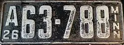 1926 | Embossed white serial on black plate with border line; vertical "MINN" at right; "26" at bottom left | none | A123-456 | A1 to approximately A249-000 | |