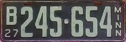 1927 | Embossed light green serial on dark green plate with border line; vertical "MINN" at right; "27" at bottom left | none | A123-456 | A1 to approximately A258-000 | |