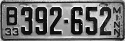 1940 | Embossed white serial on black plate with border line; "MINN - 1940" or "MINNESOTA 1940" (see right) centered at bottom | none | 123-456 | 1 to approximately 734-000 | The abbreviated state name was used on plates with serials of up to four digits (1 through 9999), and the full state name on plates with five- or six-digit serials. This practice continued through 1948. |